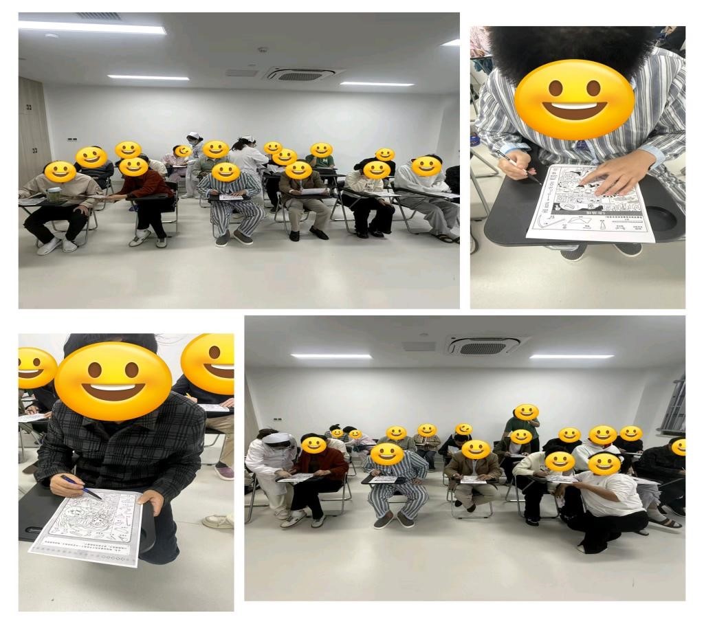 活动现场,医护人员为患者分发了多种背景的视觉搜索漫画图,引导大家独立或协作寻找图中隐藏的物品。过程中,患者们时而专注观察画面细节,时而互相提示线索,现场气氛轻松而活跃。一位患者在找到目标物品后主动分享:“我找到了那个气球!”随后,其他组员也陆续发现更多隐藏物品。医护人员从旁适时给予鼓励,既帮助患者保持注意力集中,也引导他们在交流中逐步建立互动的信心。