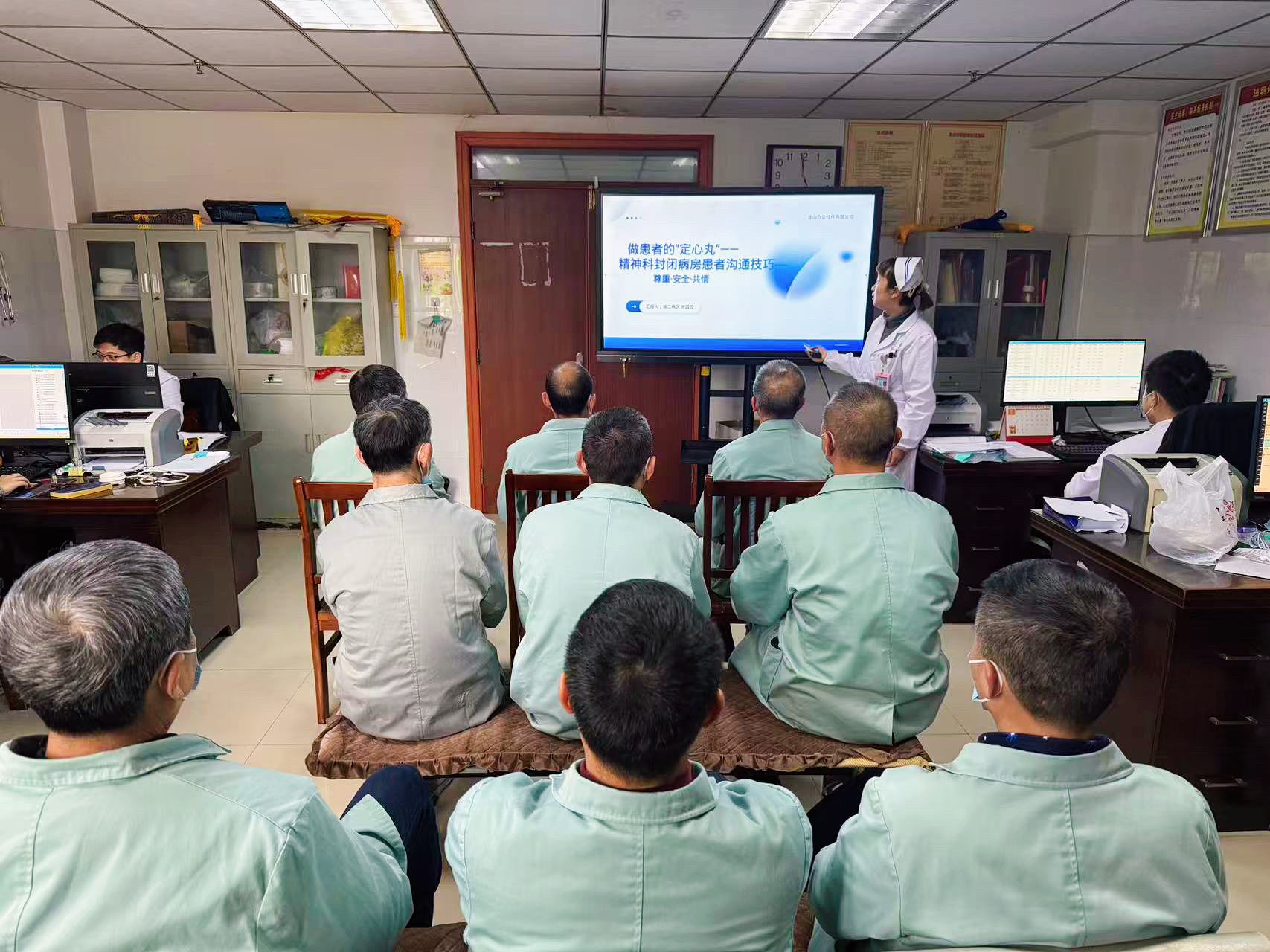 在技能培训环节,周园园护士长从非语言沟通、共情式倾听、妄想与幻听应对、柔性护理引导等方面进行细致讲解。她强调,与患者交流时应保持合适距离、温和眼神与自然肢体姿态,避免引发抵触;面对患者情绪宣泄,要先共情接纳、再合理引导;对存在幻觉妄想的患者,不争执、不否定,通过陪伴与现实导向稳定其情绪。同时,针对拒食拒药、反复纠缠、冲动倾向等常见情况,培训还讲授了具体应对方法,要求大家严守安全底线,遇突发状况及时呼叫、规范处置,既照护好患者,也保护好自身安全。