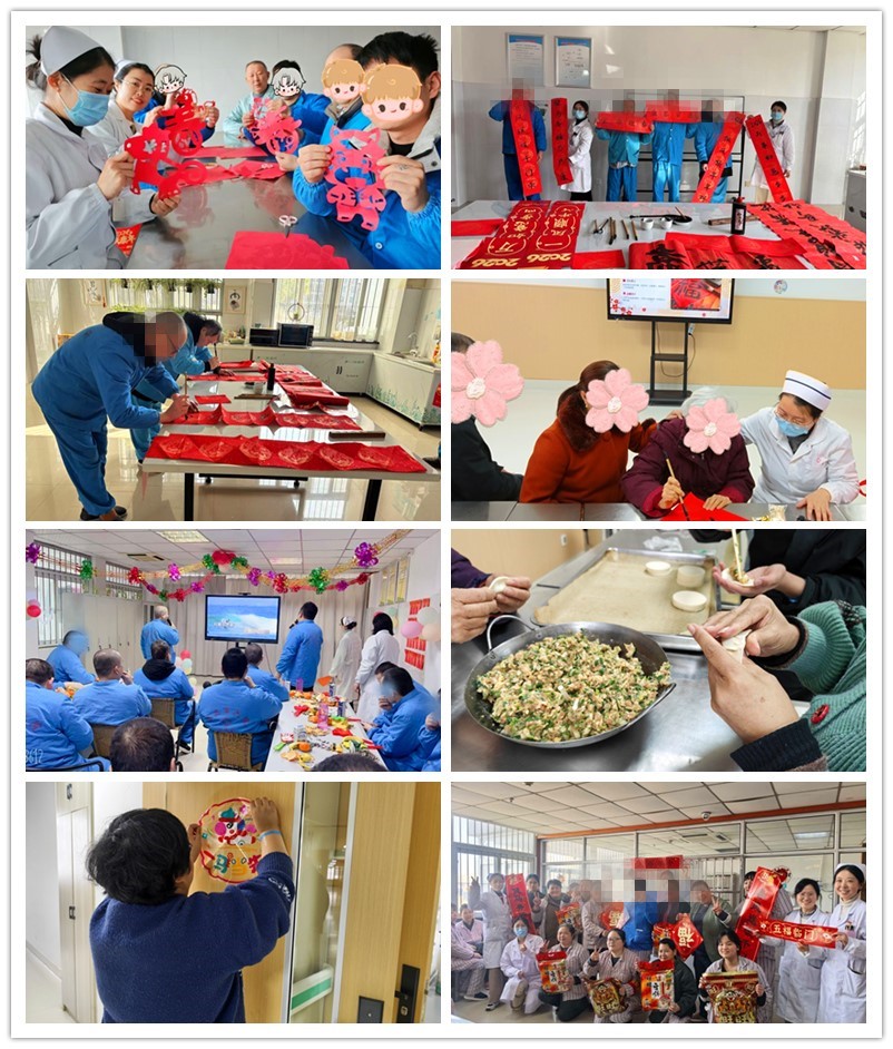功能康复中心以中国红喜迎春节为主题,将非遗技艺引入精神康复实践。患者们在康复治疗师指导下书写春联、剪刻窗花,在沉浸式创作中释放情绪、重拾自信。一幅幅饱含期许的字、一纸纸寓意吉祥的窗花,不仅是传统文化的传承,更成为患者情感表达、社会融入的重要桥梁。老年精神科组织欢乐夹豆子”“穿针引线等适龄游戏,医护人员手把手指导患者执笔挥毫,共写新春福,大红宣纸上一个个字跃然呈现,患者在笔墨飘香中舒缓身心、收获成就感。普三病区同步开展剪纸民俗体验,患者们凝神专注,剪出福字、马年生肖等吉祥图案,在指尖创作中感受传统年味。